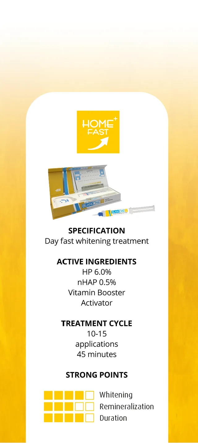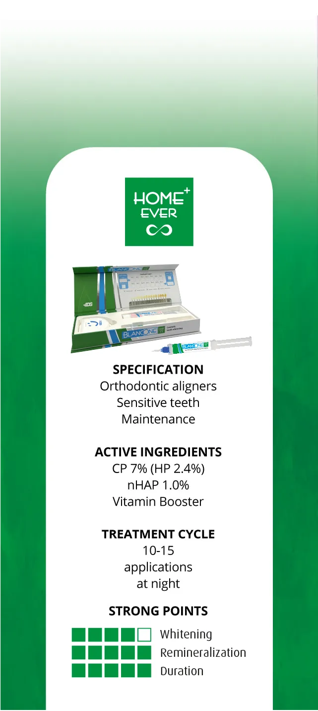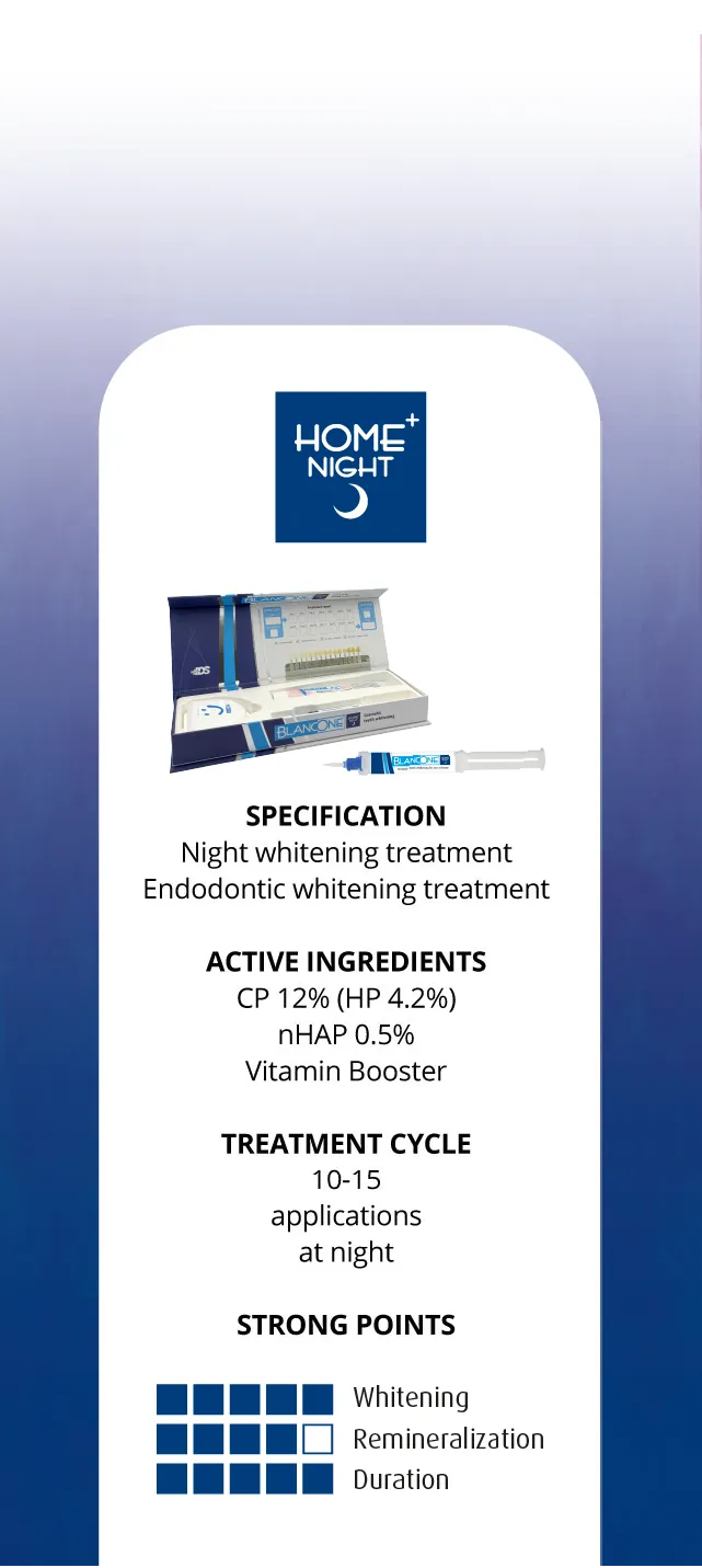 Die In-vivo-Tests, die an einer Gruppe aus 44 gleichmäßig auf die Formulierungen NIGHT und EVER aufgeteilten Patienten durchgeführt wurden, bestätigten die außergewöhnliche Fähigkeit von BlancOne® HOME + zur Zahnaufhellung in ungewöhnlich kurzer Zeit: 10 Anwendungen in 2 Wochen.