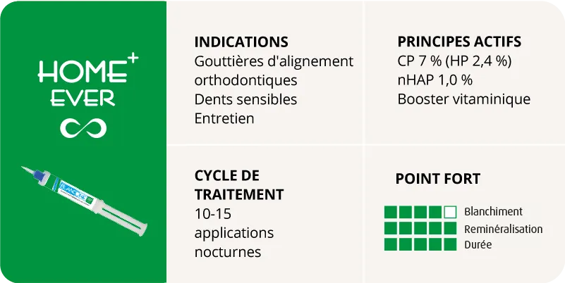 Le traitement à domicile BlancOne HOME+ EVER, à conserver à température ambiante, comprend une pratique seringue auto-mélangeuse, w qui permet de positionner facilement le gel et d’éviter les gaspillages.