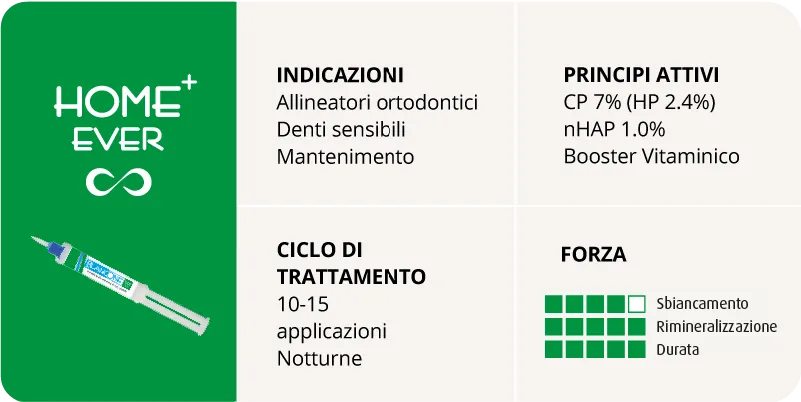 BlancOne HOME+ EVER è il trattamento di Tooth Rejuvenation che coadiuva la terapia ortodontica disgregando il biofilm, ristrutturando lo smalto, eliminando la sensibilità e prevenendo l’ingiallimento dei denti.